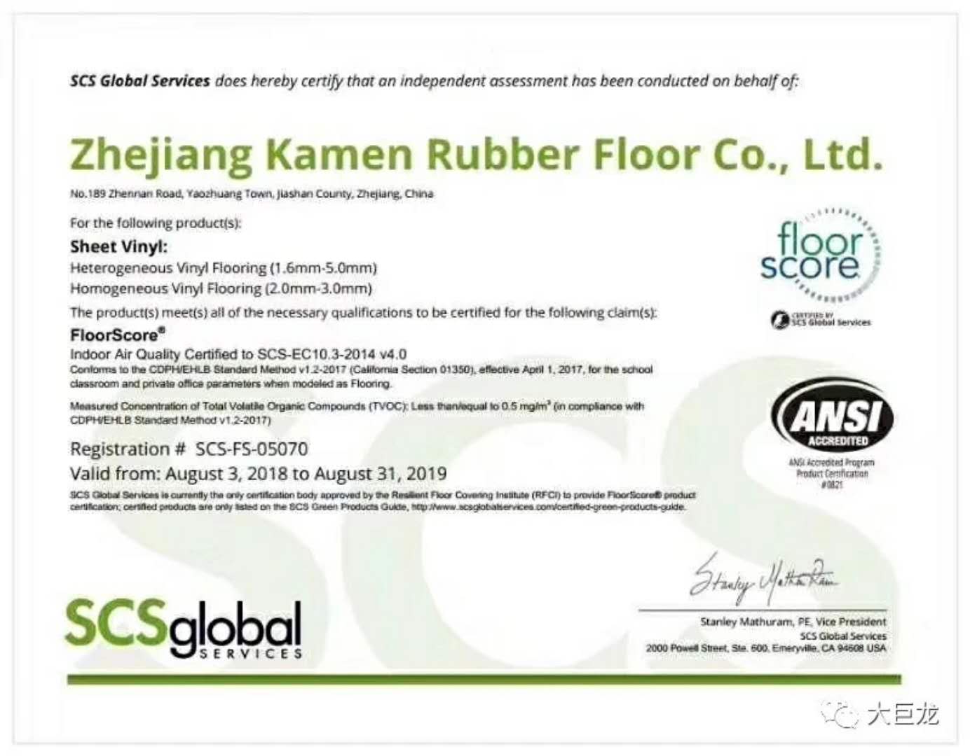 Recently, Big Dragon's PVC flooring manufacturer has been granted a new visa. After several months of rigorous on-site auditing, product sampling testing and data review, the PVC composite flooring and homogeneous and transparent PVC flooring of Dajulong Group have successfully passed the evaluation of the American Science Certification System (SCS) and obtained the FloorScore Certification Certificate.